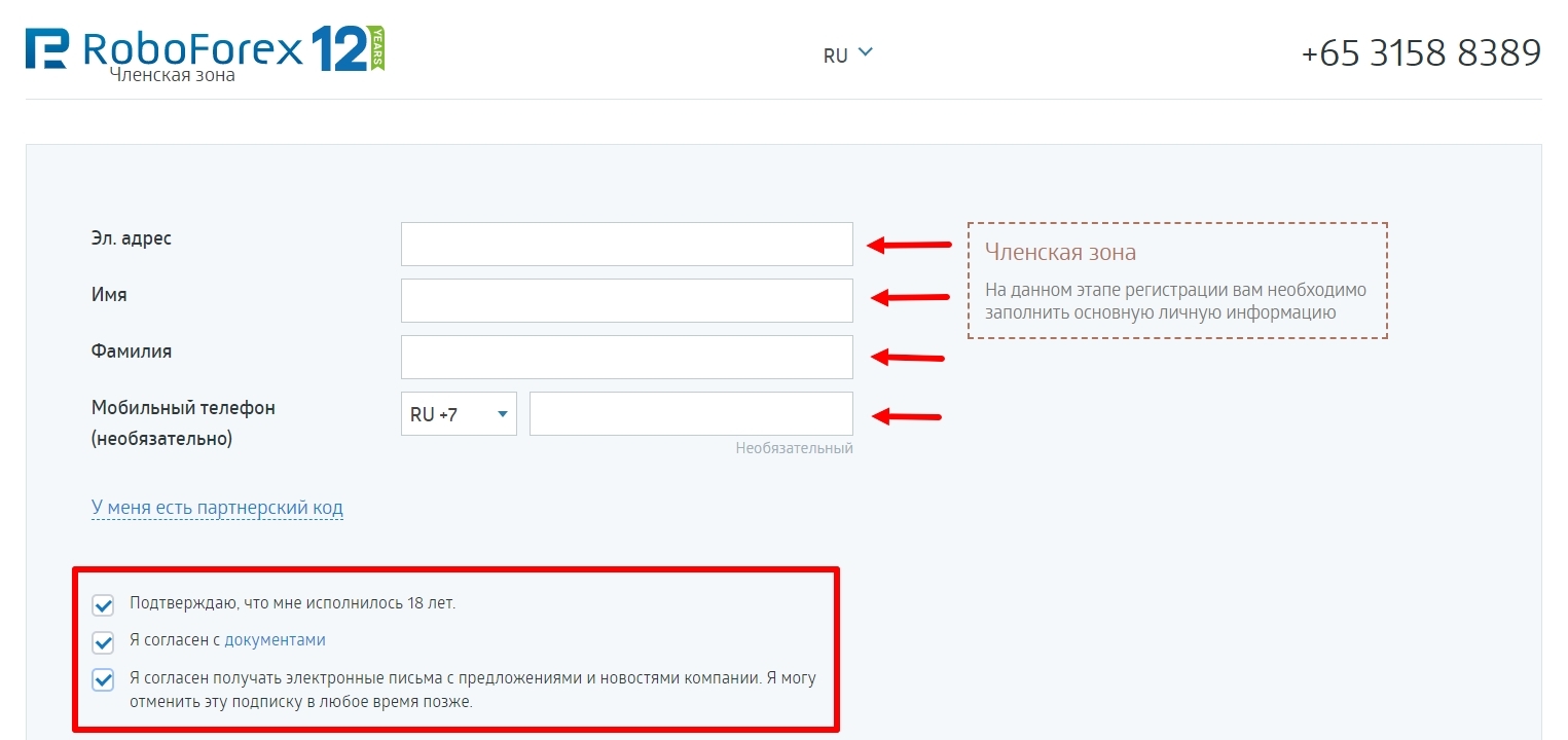 1. Переходите по реферальной ссылке на сайт брокера RoboForex для регистрации счета. Моя партнерская ссылка для перехода на сайт: https://my.roboforex.com/en/?a=ahrn При регистрации необходимо проверить код партнера: ahrn